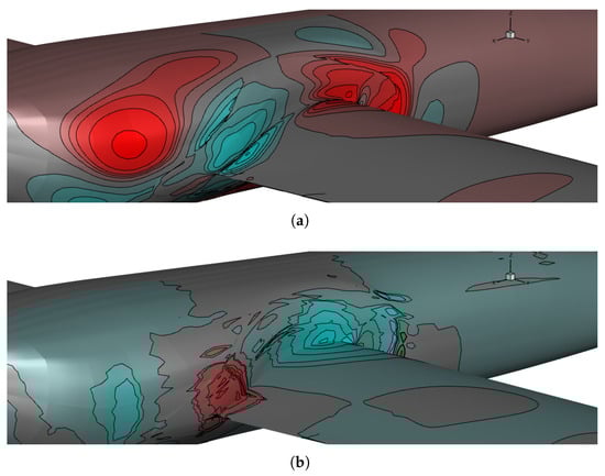 Unsurprisingly, the combination of both fuselage and wing optimization produced the best designs, as demonstrated in Section 4.3 and Section 4.4. Recalling constrained case , in order to better interpret the optimal shape design found, Figure 17 exhibits the changes in longitudinal velocity and pressure coefficient from the baseline to the optimal shape, where red and blue represent negative and positive variations, respectively. The variations in these quantities are clear around the wing–fuselage intersection region, where the shape deformation took place. Looking carefully at Figure 17a, the fuselage cross-sectional area reduction near the wing LE and increase toward the TE cause an initial airflow speed reduction and then acceleration, making the flow more energized and thus less prone to separation. This behavior is consistent with the pressure coefficient variation observed in Figure 17b: the increase in surface pressure in the fuselage region in front of the wing LE and the reduction in the fuselage near the wing TE produce a pressure gradient along the wing root chord that is less adverse and that no longer leads to secondary flow separation