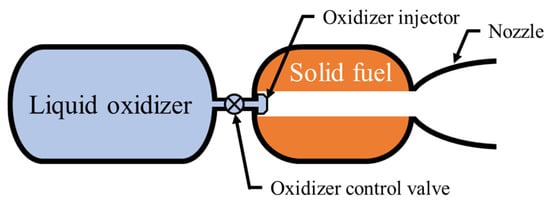 The hybrid rocket propulsion system combines features of solid and liquid propulsion systems. Figure 1 shows the conceptual design of a hybrid rocket engine (hereafter HRE) in which the liquid or gaseous oxidizer flows into the combustion chamber containing a solid fuel grain through a control valve and an oxidizer injector for combustion and generates the designed thrust. Recently, due to their throttle ability, low-cost effectiveness, simplicity, reliability, and safety, hybrid rocket propulsion systems have the potential to serve the future rocket propulsion system. Therefore, many commercial companies such as Gilmour in Australia, Innospace in South Korea, HyImpulse in Germany, and ATspace in Australia, to name a few, are currently developing satellite launch vehicles using HREs as their primary propulsion system [1].