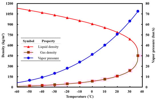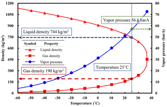 When nitrous oxide is used as a rocket oxidizer, it is stored in a liquid/vapor coexisting state. Liquid nitrous oxide serves as the primary oxidizer entering the combustion chamber to participate in the combustion reaction, while the gaseous portion is utilized for pressurization. As shown in Figure 2, nitrous oxide has a specific saturated vapor pressure at different temperatures. By measuring the pressure and temperature inside the storage tank and comparing it with the available N2O properties, the corresponding densities of N2O in the gas and liquid phases in the storage tank can be determined. Taking 25 °C as an example, the gas and liquid densities can be determined as 190 kg/m3 and 744 kg/m3, respectively, as illustrated in Figure 6.