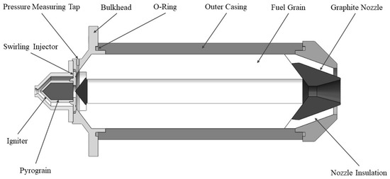 Figure 3 illustrates the cross-sectional view and overview of the combustion chamber used in this study. The oxidizer is injected into the combustion chamber through a swirling injector. The polypropylene (PP) solid fuel grain features a single-port design for simplicity of manufacturing. It has a cylindrical shape with an outer diameter of 80 mm, an initial inner diameter of 26 mm, and a length of 240 mm, and this size provides sufficient fuel supply for the 8 s burn time. Both ends of the grain have a tapered configuration, and a step is designed upstream of the fuel to create a recirculation zone, ensuring smooth engine ignition by a pyrograin igniter. The nozzle has a simple conical design, which is made of graphite, with a throat diameter of 10 mm and an expansion ratio of 6.25. This hybrid rocket engine is designed to produce a thrust of 45 kgf, a chamber pressure of 40 barA, an average oxidizer/fuel (O/F) ratio of 7 (based on pure N2O), and a specific impulse of 220 s.
