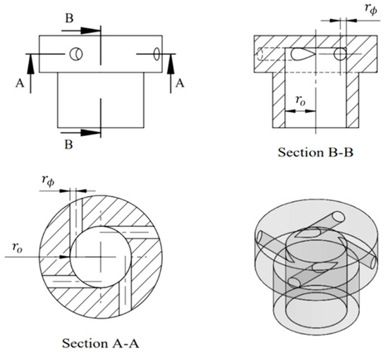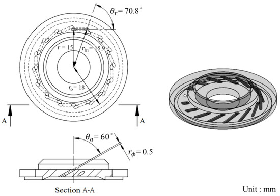 In this research, the geometric swirl number of the oxidizer injector is designed to be 58.5 to enhance the swirling effect. This value is higher than the typical design due to its liquid state when injected into the chamber. The detailed geometric dimensions of the oxidizer injector are shown in Figure 5, and the geometric swirl number parameters are summarized in Table 2. Considering the injection angles of the tangential inlet ports in both the radial and axial directions, the geometric swirl number is further derived from Beer et al. [14] and defined as follows: