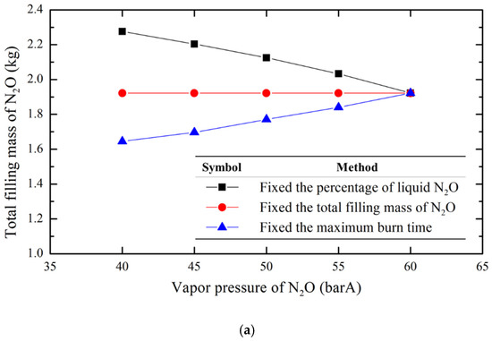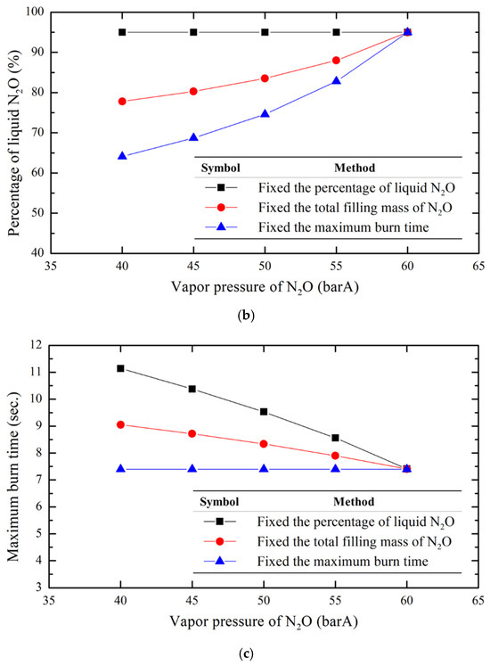 Comparison of three filling methods under various vapor N2O pressures: (a) the total filling mass of N2O; (b) the percentage of liquid N2O; (c) the maximum burn time.