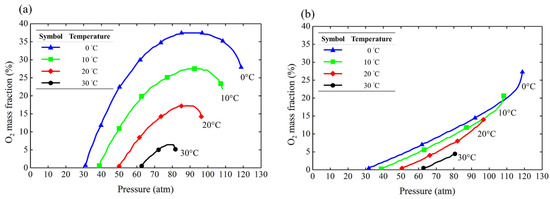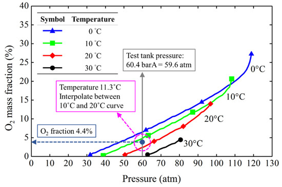 For the theoretical model of Nytrox, Karabeyoglu [8] employed the Peng–Robinson method to model the properties of Nytrox. Whitmore and Stoddard [10] also applied the same model to establish a method for calculating the properties of Nytrox at various temperatures and pressures. They developed mass fraction and density diagrams for O2 dissolved in both gaseous and liquid N2O at different pressures and temperatures. In this study, the O2 solubility data in the temperature range of 0 °C to 30 °C were extracted and replotted in Figure 8 in which the curves are presented as isotherms in the vapor phase (Figure 8a) and liquid phase (Figure 8b), respectively. For example, by measuring the actual temperature and pressure in the running tank and referring to the corresponding temperature and pressure solubility plot in Figure 8b, the mass fraction of O2 in the liquid-phase mixture can be readily obtained. A typical procedure for estimating the oxygen mass fraction in the liquid is illustrated in Figure 9. For example, the N2O temperature is 11.3 °C, and gaseous O2 is bubbled into the liquid N2O to reach a pressure of 60.4 barA. Then, the mass fraction of O2 in the liquid N2O can be determined as 4.4%. This is obtained by interpolating data between two isotherms (10 °C and 20 °C).