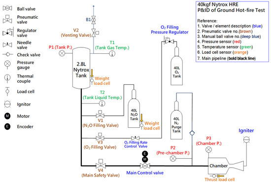 Figure 10 shows the oxidizer filling and feeding system for the ground static hot-fire tests of the nitrous oxide and Nitrox hybrid rocket engine. It consists of a running tank with an integrated mass load cell, a N2O and O2 filling system, a nitrogen cooling pipeline, multiple pressure transducers, many K-type thermocouples for monitoring the running tank and pipeline, a load cell for measuring instantaneous thrust, and an open-loop control valve capable of delivering both low and full flow rates of oxidizer, respectively, for ignition and hot-fire burning. All the test procedures were automated using a DAQ system (Model No. cRIO-9074, National Instruments, Austin, TX, USA).