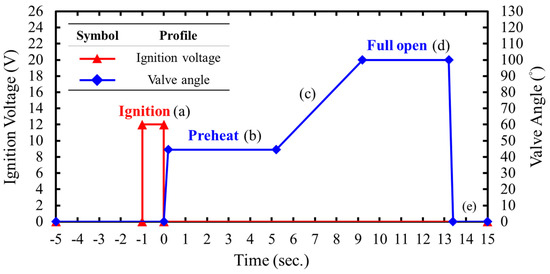 The automatic process profile of the hot-fire test. (a) ignition, (b) control valve preheating open, (c) control valve opening process, (d) control valve fully open, and (e) control valve fully closed.