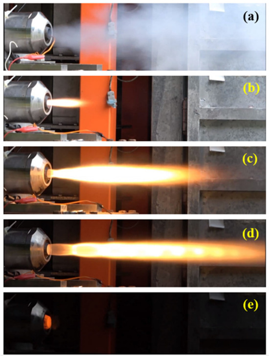 The flame images during the tests at different stages: (a) ignition, (b) preheating, (c) control valve opening process, (d) control valve fully open, and (e) flameout and cooling.