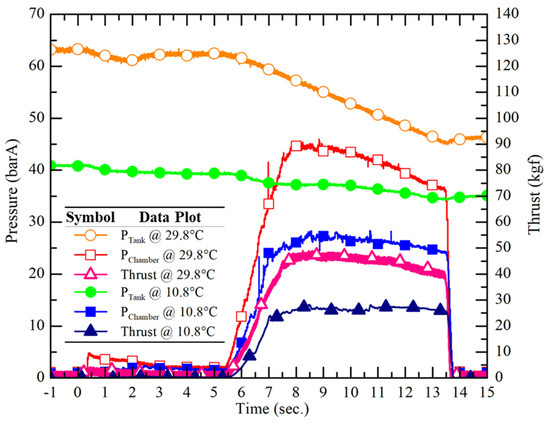 We followed the engine automated procedure in Figure 11 to carry out the subsequent hot-fire tests. Figure 13 illustrates the measured temporal variations in tank pressure, chamber pressure, and thrust in two ground hot-fire tests using pure N2O at the highest (29.8 °C, vapor pressure 63.1 barA) and the lowest (10.8 °C, vapor pressure 40.9 barA) N2O temperatures, respectively. This result shows the typical pressure variation characteristics of the N2O blowdown system. Tank pressure begins to drop continuously during preheating, with a more significant pressure drop after the valve is officially opened. This occurs because, during the N2O blowdown process, the temperature of N2O decreases due to liquid vaporization, leading to a continuous decrease in N2O vapor pressure. Therefore, even if the valve opening angle remains unchanged, the N2O flow rate tends to decrease gradually during the hot-fire test. After the test, the combustion time and total impulse are calculated for the period when the combustion chamber pressure is above 20 barA. The fuel and oxidizer mass flow rates are obtained by dividing the weight difference between the fuel and oxidizer before and after the test (minus the preheating amount) by the combustion time. Finally, Isp is obtained by dividing the total impulse by the weight difference in the total propellant before and after the test (minus the preheating amount).