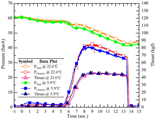 Figure 14 illustrates the temporal variations in tank pressure, chamber pressure, and thrust in two ground static hot-fire tests using the Nytrox oxidizer at the highest (22.6 °C, vapor pressure 53.6 barA) and the lowest (5.9 °C, vapor pressure 36.3 barA) N2O temperatures, respectively. Similarly to the results in Figure 13, this result shows the typical pressure variation characteristics of the blowdown system. The key difference is that similar pressure variations occur even with different initial N2O temperatures. This is because lower tank N2O temperatures lead to lower N2O vapor pressures, which in turn increase O2 solubility, as shown in Figure 8. Higher oxygen solubility allows for increased oxygen release during the pressure drop, compensating for variations in N2O vaporization at lower N2O vapor pressures. It is expected that the primary process before the tank pressure reaches the N2O vapor pressure will be the release of dissolved oxygen from the Nytrox, resulting in a gradual decrease in the oxygen content of the Nytrox injected into the combustion chamber.