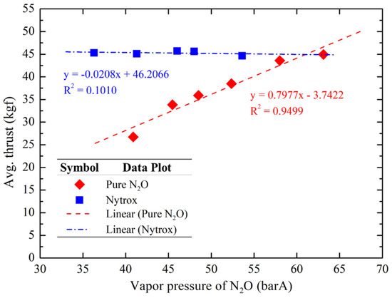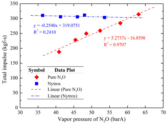 Figure 15 and Figure 16 illustrate the average thrust and total impulse data, respectively, using two different oxidizers with varying N2O vapor pressures due to different N2O temperatures during the hot-fire tests. The results indicate that the thrust and total impulse of the pure N2O tests exhibit an almost linear regression with the N2O vapor pressure (pure N2O in this case), whereas the Nytrox tests maintained a nearly constant thrust (45.3 ± 0.7 kgf) and total impulse (307.6 ± 3.9 kgf·s) in the range of N2O vapor pressures (N2O with a small fraction of O2 in this case) tested. The trending lines of both oxidizers (N2O and Nytrox) converge near the target O2 pressurization pressure (~60 barA), suggesting that deviations in O2 pressurization pressure during Nytrox preparation would result in the total impulse and thrust values approaching those of the pure N2O result at the same tank pressure. It should be noted that the initial tank pressure of the Nytrox system was 60.4 ± 0.4 barA, while the initial tank pressure of the pure N2O system matches its vapor pressure.
