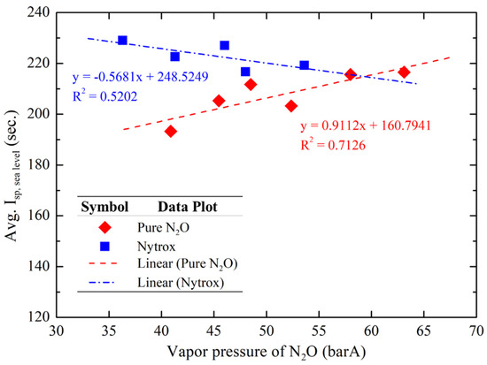 Furthermore, Figure 17 compares the average sea-level specific impulse of the pure N2O and the Nytrox hot-fire tests with varying N2O vapor pressures. The results indicate a positive correlation for the pure N2O tests. Conversely, a negative correlation was observed for the specific impulse of the Nytrox tests in the range of N2O vapor pressures tested. As shown in the dissolved O2 mass fraction data in Figure 8 and Table 4, this discrepancy arises because lower tank N2O temperatures result in lower N2O vapor pressures, which in turn lead to higher O2 solubility. In this case, as described in the study by Whitmore and Stoddard [10], increased dissolved O2 in the liquid oxidizer enhances combustion performance. Additionally, the O2 released from the Nytrox liquid helps maintain tank supply pressure automatically. This allows the combustion chamber pressure to remain at the optimal value for the nozzle design, thereby improving the overall theoretical Isp. These findings confirm that the Nytrox approach effectively improves and stabilizes the performance of the N2O-based hybrid rocket propulsion system. Moreover, an experimentally observed trend indicates that the lower the N2O temperature is, the better the Nytrox hybrid rocket engine performance is.