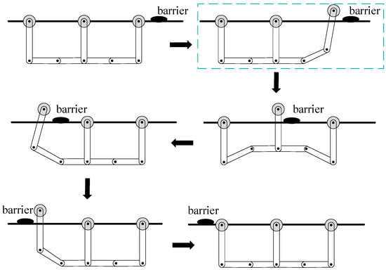 This paper analyzes rigid–flexible coupling dynamics based on a three-armed overhead line mobile robot configuration. Taking the overhead line as the motion environment, for the obstacles on the overhead line, the obstacle-crossing action process [31] is shown in Figure 1. The figure shows the movement of the robot with different robotic arms crossing obstacles on the overhead line. This paper focuses on analyzing one of these obstacle-crossing actions.