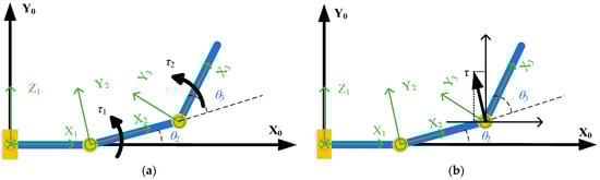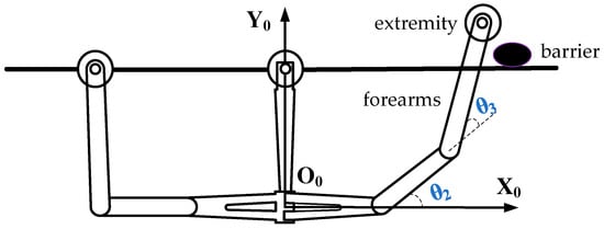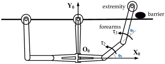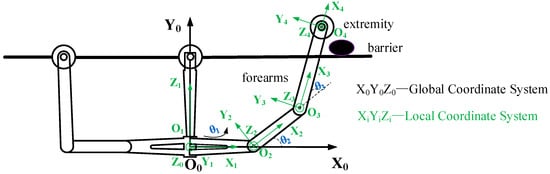 In this paper, the rigid–flexible coupling dynamics of the robot forearm lifting over obstacles is analyzed as shown in Figure 4.