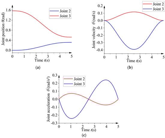 Under ideal rigidity conditions, the trajectory of the robot forearm lift was planned using the cubic polynomial trajectory Formula (2). The initial angles of the two forearm joints were 0 and π/2, respectively, and the final angles were π/10 and π/6, with a completion time set to 5 s. The curves of the angle, angular velocity, and angular acceleration for the two forearm joints are shown in Figure 3.