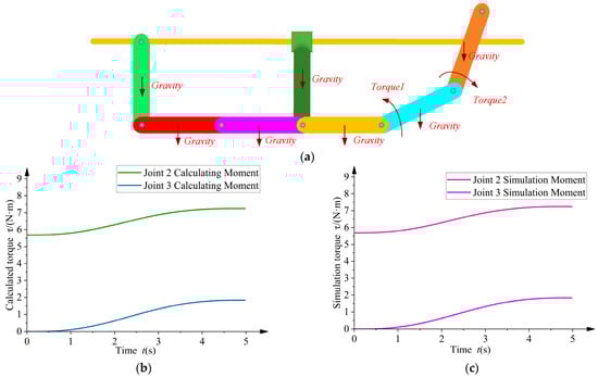 In this paper, the dynamics of the rigid–flexible coupled system is established by combining the dynamic characteristics of the overhead line environment and the dynamic characteristics of the rigid robot analytically, so the rigid dynamics of the overhead line are the basis for establishing accurate rigid–flexible coupled dynamics. In order to verify the correctness and reasonableness of the rigid–flexible coupled dynamics model of the overhead line mobile robot established in this paper, the established rigid dynamics model was simulated and verified. Using the planned trajectory shown in Figure 3 as the input, the theoretical joint torque under rigid conditions was calculated using numerical simulation software based on Equation (7). Meanwhile, dynamic simulation software was used to perform motion simulations on the robot model, obtaining the joint torque from the simulation results. The simulation results are shown in Figure 5b,c. The calculated torque matches the torque obtained from the simulation, so the simulation results show that the rigidity dynamics model of the overhead line mobile robot is valid.