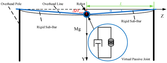 Rigid–flexible coupled dynamics was used to further investigate the complex dynamical phenomena of rigid and flexible body interaction on the basis of rigid dynamics. The overhead line, as the operating environment of the mobile robot on the line, can be regarded as the flexible base of the robot, so the deformation of the flexible base will affect the end position of the mobile robot on the overhead line. Zhang [32] established a simplified vertical dynamics model of scissor seat suspension and utilized a spring–damping system to describe the vertical dynamics model of scissor seat suspension. Sharifnia [33] presented a model for dynamic and vibration analysis of a robot with a flexible mobile platform and assumed that the in-plane bending stiffness of the beam is much higher than the out-of-plane bending stiffness, thus neglecting the in-plane transverse vibration of the beam. In this study, it is assumed that the overhead line has sufficiently high bending, twisting, and shear stiffness, so its out-of-plane swaying can be neglected [34].