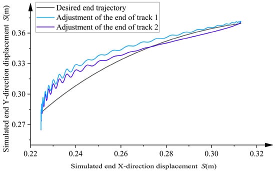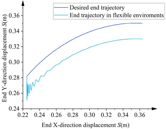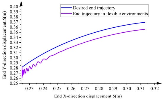From Figure 9, the deviation produced by the forearm end y and the ideal end trajectory of the overhead line mobile robot in the flexible environment can be determined. was added to the original planned end trajectory y, keeping x constant, as follows: