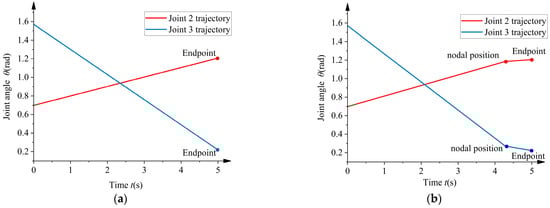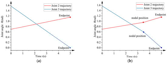 Joint trajectory adjustment of the robot under a 2 m overhead line: (a) The first set of joints to adjust the movement trajectory; (b) the second set of joints to adjust the movement trajectory.
