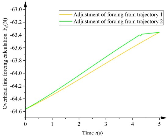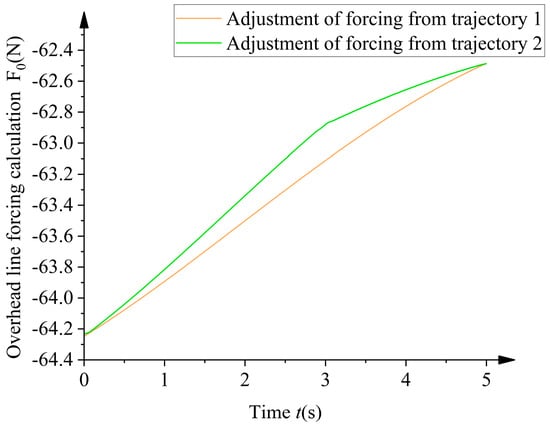 This vibration is caused by the robot’s movements. Based on the system dynamics theory and forced vibration response analysis, the potential vibration situation of the robot under different trajectories was analyzed. Suitable adjusted trajectories were selected to minimize the vibration effects and improve the robot’s operation accuracy and stability. The two sets of adjusted trajectories were substituted into the forcing force f0 (Equation (10)) to obtain the effects of the two sets of adjusted trajectories on the forced vibration of the robot. The results are shown in Figure 12. The forcing force generated by the second set of adjustment trajectories is significantly smaller than that of the first joint adjustment trajectories. The smaller the forcing force applied to the overhead line, the smaller the vibration generated by the overhead line.
