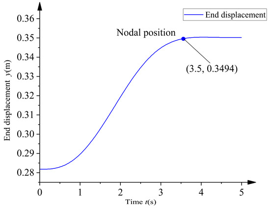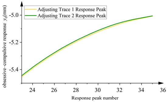 Adjustments were made to the motion trajectories of joints 2 and 3 using the active compensation method mentioned earlier. The system outputs for two different trajectories were calculated to validate the dynamic system response. The system response generated by the trajectories was calculated using the convolution integral (Equation (15)) to analyze and evaluate the dynamic performance of the different trajectory scenarios. Figure 13 was obtained by computing the dynamic response using Equation (15) and extracting its peak value. Figure 14 was derived by substituting the adjusted trajectory sets into Equation (16) and performing the corresponding calculations. The simulation analysis results show that when both sets of end trajectories can reach the desired trajectories, the vibration of the tuned trajectory 2 is relatively smaller and more quickly stabilized, which can effectively reduce the vibration of the system and improve the stability of the robot operation.