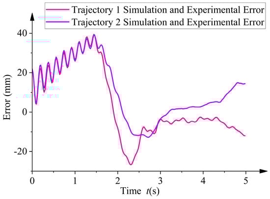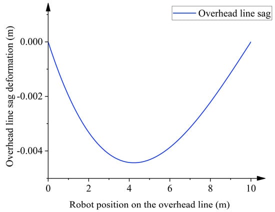The simulation results show that, for the same joint trajectory, the robot’s end in the flexible environment is lower than the end in the ideal state. As the motion of the robot exerts a forcing force on the overhead line, this leads to the vibration of the overhead line. The vibration is transferred to the robot and is reflected in the end vibration of the robot. Due to the damping of the overhead line, the vibration decreases and the trajectory gradually stabilizes. This vibration not only hinders the robot’s normal movement but may also lead to collisions with obstacles [38].