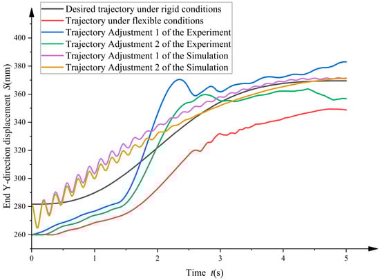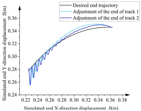 After data processing, the trajectory data were compared and analyzed, as shown in Figure 28. Trajectory adjustment 1 is the end-effector trajectory of the robotic arm obtained based on the first set of adjustment strategies. Trajectory adjustment 2 is the end-effector trajectory of the robotic arm obtained based on the second set of adjustment strategies. The experimental results show that compared with the original trajectories, the two sets of optimized trajectories are closer to the desired trajectories in the Y direction. The errors are shown in Table 3; trajectory adjustment 1 reduces the average error by 1.83 times compared to the original trajectory, and trajectory adjustment 2 reduces the average error by 2.1 times compared to the original trajectory.