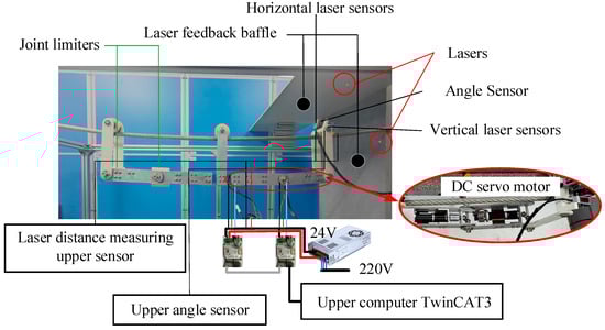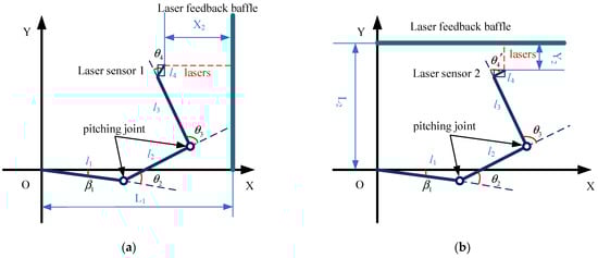 Here, β1 is the pitch angle of the robot’s forearm manipulator due to changes in the robot’s center of gravity during the experimental process, measured as β1 ≠ 0; θ2 and θ3 are the pitch joint angles; and θ4 and θ4′ are the deflection angles of laser sensors 1 and 2, respectively.