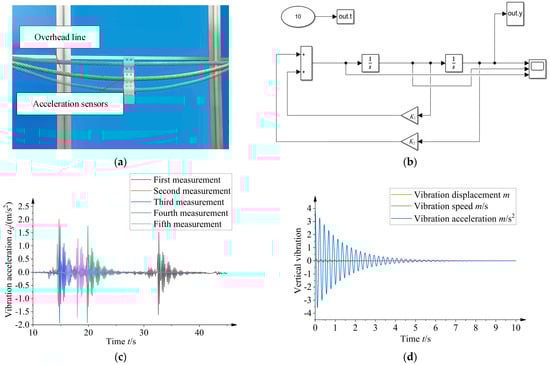 Figure 23. Overhead line damping measurements: (a) experimental environment setup for overhead lines; (b) spring–damping simulation system mode; (c) free vibration acceleration curves for overhead lines under heavy loads; (d) simulation curves for single-degree-of-freedom spring–damping system under heavy loads. - (3)