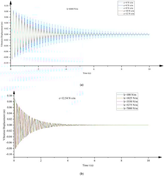 To further analyze the impact of these parameters on the system’s behavior, this paper examines the effects of the damping coefficient c and spring constant k on the system’s vibration response. With a fixed spring constant k = 6468 N/m and a virtual damping coefficient c = 12.54 N·s/m, the virtual damping coefficient c and spring constant k are varied. Figure 24 shows the system’s vibration response under different virtual damping and spring constants. As shown in Figure 24a, with an increase in the damping coefficient, the system’s vibration amplitude gradually decreases, and the vibration frequency also decreases. As shown in Figure 24b, the increase in the spring constant results in a higher vibration frequency, but the change in vibration amplitude is minimal.