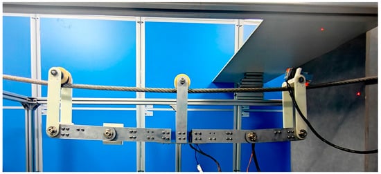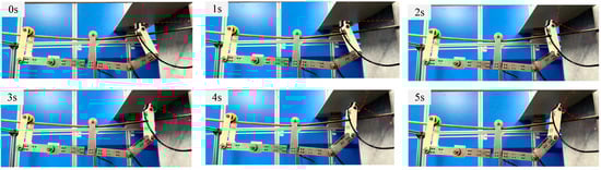 To verify the effectiveness of using the rigid–flexible coupling dynamic model for output response to determine and select an active compensation trajectory method, an experimental validation of the robot’s active compensation trajectory was conducted in an overhead line environment with a span of two meters. The initial state of the overhead line mobile robot is shown in Figure 25, and the experimental process is shown in Figure 26. The specific experimental steps were as follows: