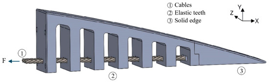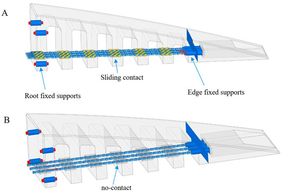 As shown in Figure 3, two fixed supports are used for the boundary condition; the “root fixed supports” fix the first tooth (and the whole ET rib) to the wing box, while the “edge fixed supports” fix the elastic teeth to the solid edge part. These boundary conditions are the same for both sliding and no-contact configurations. However, the difference between the two configurations lies in the boundary condition between the cables and holes. The sliding contact and no-contact configurations are illustrated in yellow and gray colors, respectively (Figure 4A,B).