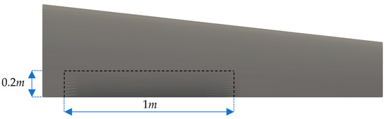 The current study focuses on the actuation mechanism of the SMTE flap-based on previous study findings that are utilized to define the aerodynamic and structural characteristics of the SMTE flap. For example, the proposed Elephant Trunk Mechanism (ETM) must adhere to certain requirements derived from the aerodynamic analysis. The first requirement involves geometrical constraints, ensuring that the SMTE flap dimensions in the current study match those used in the aerodynamic study. The second requirement refers to the maximum vertical deflection of the SMTE flap, to be achieved by the ETM. Additionally, achieving the desired vertical deflection must satisfy structural criteria, such as the factor of safety, mechanism stiffness, material selection, and structural weight. The aerodynamic loads acting on the wings’ trailing edge, containing the SMTE flap, were incorporated in the material selection and adjusting the actuation forces acting on the ETMs. Figure 3 illustrates the geometrical dimensions of the SMTE flap that the proposed actuation mechanism must comply with.