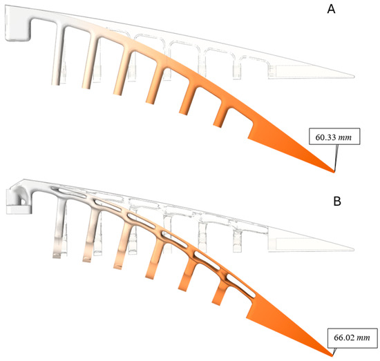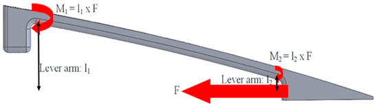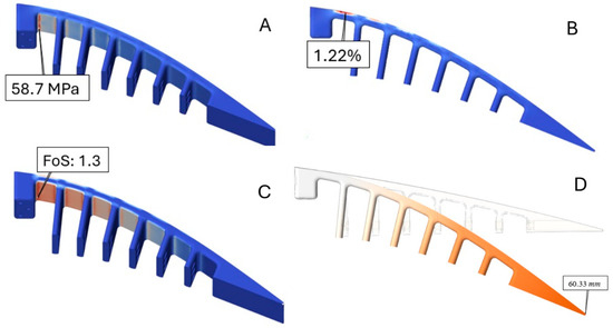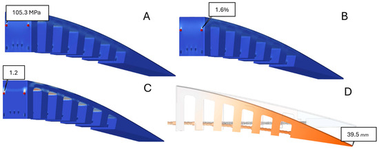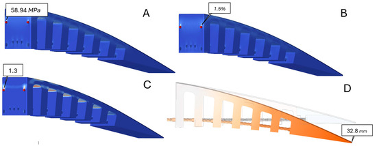 In addition, the maximum attainable displacement of the edge can also be calculated, given the fact that it should respect the maximum displacement obtained from our previous study for increasing range [28], which was found to be 26 mm in the downward direction. The results show that using the given force (750N), a maximum deformation of 32.8 mm in the downward direction is obtained (Figure 5D), which is higher than 26 mm.
