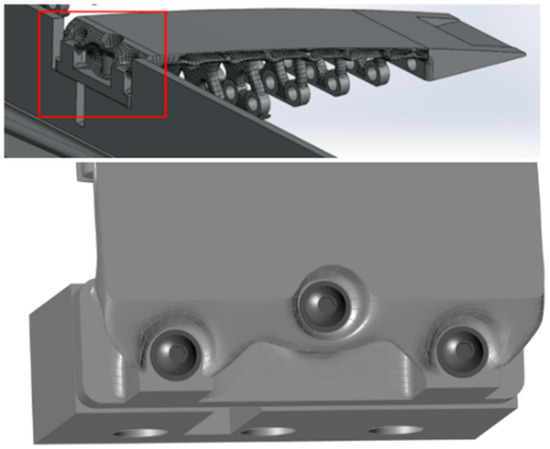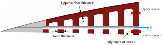 Some geometrical modifications to the sliding configuration were required to improve the robustness of the structure, based on the results obtained in a structural analysis (Figure 4), especially to reduce the stress concentration around the screws, increase the reliability of ETM, and increase the maximum displacement of the elephant trunk (ET) rib. Two analyses are performed in this regard: 1. analysis of the teeth number and thickness, 2. analysis of the upper surface thickness. The first analysis aimed to find the optimum number of teeth for ETM along with their optimum thickness by considering the ETM weight and vertical displacement, and the second analysis was performed to improve the reliability and flexibility of the ETM by finding the best thickness for the upper surface. In the final step, the fixation of the ETM to the wing box was modified with the aim to reduce the stress concentration on the upper screws. Figure 7 depicts the initial ETM, in which the teeth thickness, upper surface thickness, and fixation to the wing box are specified.