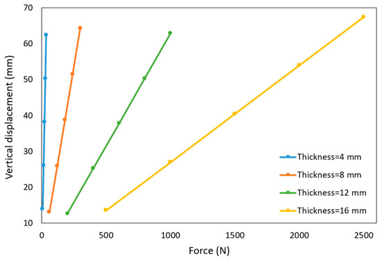 Table 6 indicates that by increasing the thickness, the force required to obtain the same magnitude of displacement also increases, which leads to an increase in the von Mises stress and weight of the whole ETM and a reduction in the factor of safety. For example, for the thicknesses of 4 mm and 16 mm, to obtain a displacement of approximately 62 mm, the required force increases from 35 N to 2500 N, von Mises stress increases from 33.6 MPa to 208.2 MPa, and the total ETM weight increases from 81 g to 201 g, while the factor of safety reduces from 2.2 to 0.4. To have a clear understanding of the values shown in Table 6, Figure 9 and Figure 10 show the variations of the vertical displacement and von Mises stress with the forces for different upper surface thicknesses.