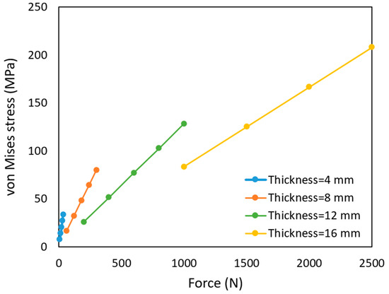 Variation in the von Mises stress with the force magnitude for different upper surface thicknesses.