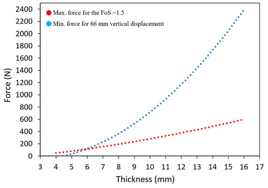 In this study, the maximum desired displacement is 66 mm, which corresponds to the maximum vertical displacement obtained in our previous study [37]. To find the corresponding thickness for this vertical displacement, the ETM should meet the minimum factor of safety criteria, as mentioned in the Federal Airworthiness Regulation Part 25.303: “Unless otherwise specified, a factor of safety of 1.5 must be applied on the prescribed limit load, which are considered external loads on the structure” [49]. For this purpose, for upper surface thicknesses ranging from 4 mm to 16 mm, the maximum force for obtaining the minimum factor of safety of 1.5 was calculated, and then the minimum required force for obtaining the 66 mm displacement was also calculated. Figure 11 shows the variations of these forces with the thickness.
