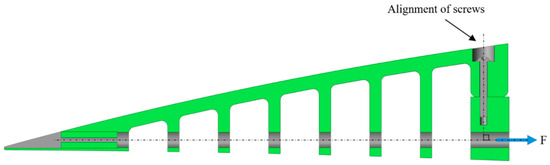 As shown in the initial design of ETM (Figure 7), due to the distance of the upper screws from the cables, when the ETM deforms in the downward direction, the upper screws sustain a higher force than that of the lower screws; therefore, higher stress concentrations are expected around the upper screws, as shown in Figure 5 and Figure 6. Therefore, instead of a horizontal fixation of the rib to the wing box, this rib was fixed using three screws at the top of the rib. This type of fixation reduces the stress concentration around the screws and moves it to another non-critical area. In the vertical fixation, no tensile force was expected to act on the screws, since the external force direction was perpendicular to the alignment of the screws.