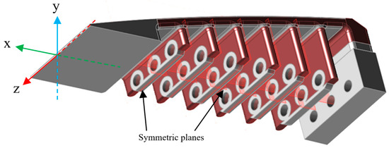 The fixation of the ET rib to the wing box is performed with screws on the first solid tooth, which restricts any motion on the first tooth. Three cables pass through the interface (the interface of the wing box and the ET rib); they pass through the holes in the teeth all the way to the solid aluminium edge, where they are firmly fixed. Two configurations are set up for the finite element analysis of the cables. In the first analysis, the cables have a “sliding contact” with the teeth’s holes so that equal forces are applied to all teeth simultaneously. In the second configuration, the cables move freely within the holes, and “no contact” is defined between them and the teeth. In the sliding configuration, both the hole and the cable diameters are 3 mm, while in the no-contact configuration, the diameters of the holes are 4 mm and the diameters of the cables are 3 mm. Figure 4 shows the boundary conditions for both configurations.