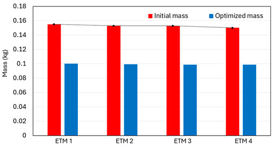 Different thicknesses are studied, ranging from 4 mm to 16 mm. Their analysis requires the ETM to preserve its elastic deformation. With the elastic behavior being set, it is expected that both the displacement and the effort will be linearly proportional. For each thickness, the vertical displacement is set to be constant while applying different force magnitudes. With this assumption, several structural parameters, including factor of safety, von Mises stress, and structural weight, are calculated for each thickness. Table 6 indicates the values of these structural parameters for each thickness.