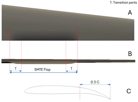The aerodynamic aspects of the SMTE flap were analyzed in a previous study [37], where key characteristics such as aerodynamic efficiency, pressure distribution, and vorticity around the SMTE flap were analyzed. The entire flight envelope for the UAS-S45, including climb, cruise, and descent phases, was considered. Using the DAFoam optimization framework [47,48], the optimal aerodynamic configuration of the SMTE flap was found for each flight condition. Additionally, a comparison was made between the SMTE flap and conventional hinged flaps aerodynamic performance.