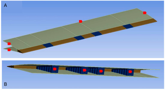 An Adaptive Trailing Edge Device (ATED) with rotatory segmented ribs was designed by Pecora et al. [28]. The structural analysis based on advanced FE analyses was performed, revealing that the proposed mechanism was reliable in terms of stress and maximum load conditions, as well as elastic stability. A novel concept of variable camber morphing leading and trailing edge sections was introduced by Takahashi et al. [29]. A prototype was manufactured, and both finite element structural analysis and an aerodynamic analysis were performed. The deformation of the leading and trailing edges was achieved by the corrugated structure embedded within the lower and upper surfaces of the wing; the deformation was induced on the corrugated structure by a wire connected to a servomotor. Finally, wind tunnel tests on the manufactured morphing wing prototype were performed, and a successful actuation at the speed of 20 m/s airflow was achieved. Barbarino et al. [30] proposed an innovative flap architecture for variable camber trailing edges based on the variable geometry truss concept. The compliant rib was based on a truss-like structure, on which some of its parts were “active” rods made of Shape Memory Alloys (SMAs). These actuators were able to sustain the external loads while allowing controlled shape modification. An optimization process based on a genetic algorithm was established to optimize the topology of the internal truss structure. In a joint project called the Adaptive Compliant Trailing Edge (ACTE), conducted by the U.S. Air Force Research Laboratory (AFRL), NASA, and FlexSys Inc. [5,31], a series of flight tests were conducted on a Gulfstream GIII business jet with variable geometry multifunctional control surfaces, with the purpose of eliminating the trailing edge flaps. The test flight was conducted up to Mach = 0.75 and a maximum altitude of 40,000 ft. In this design, the control surface was bounded with left and right transition sections, which eliminated all discontinuities on the wing body. The main purpose of the flight tests was to demonstrate the robustness and feasibility of the FlexFoil material; they confirmed that the ACTE was structurally feasible and could perfectly sustain the maximum design loads of commercial aircraft for over 50 h of flight tests without any failure.