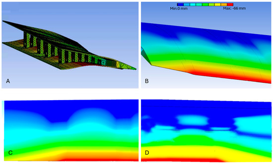 Next, using the sliding contact boundary condition, the mechanism was structurally analyzed, and the results were further improved by geometrical modification. These modifications were analyzed in three ways: 1-analysis of finding the optimum number of teeth and their thicknesses, 2-upper surface thickness analysis, and finally, the analysis of the ETM fixation to the wing box. Following the ETMs’ structural modifications, the stress was reduced by 0.4%, and the stress concentration moved to a non-critical area; the maximum strain was reduced by 19%, and the ETM maximum vertical displacement increased by 45.63%, all of which improved the ETMs’ structural flexibility.