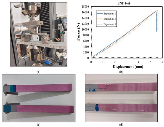 Application of ENF test (a), F-D curves for ENF tests (b), the cohesive failure in the adhesive layer was observed on DCB specimens (c) and ENF specimens (d).