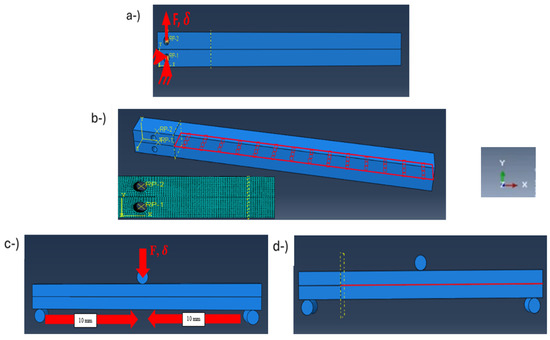 In the modelling of both DCB and ENF tests, the mesh parameter of the material to be bonded is selected as a cohesive element. The adhesive joint is defined as a 2D surface contact in the analysis program. Adhesive surfaces can be defined in 2D (triangular, quadrilateral) or 3D (tetrahedron, hexahedron, pyramid) in analysis programs. The 3D model enables detailed stress analysis on the adhesive at a smaller scale while significantly increasing analysis time. In this context, contact surface modelling is performed as the adhesive properties can be given directly from the program as master-sleeve contact. The Abaqus program offers only bilinear and exponential options when solved in energy type within the scope of the traction–separation law. These analyses were solved with the bilinear smoothing option, considering that the solution of the bilinear traction–separation law graph gives good results and is solved faster [40]. DCB and ENF tests were modelled to be exactly the same as the measurements made in real tests. In the DCB and ENF test modelling with 1 mm/min displacement, Figure 3a shows the fixed support and displacement application point of the DCB model. Figure 3b shows the application of the surface contact adhesive and the mesh structure in a 1 mm size. Figure 3c shows the application of the displacement force at a distance of 10 mm from the fixed support points for the ENF test, and Figure 3d shows the application of the surface contact adhesive for the ENF test.