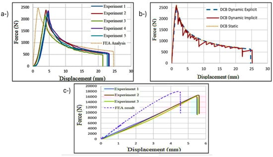 The choice of model and parameters, like stabilisation methods and output frequency, can significantly influence the results. Three different methods (finite element, static ~ dynamic implicit, and dynamic explicit methods) can be used for CZM studies. To observe the differences between the static solver, dynamic explicit solver, and dynamic implicit solver, the DCB test was modelled in ABAQUS software with the same dimensions as real tests and solved using all three solvers. Force–Displacement (F-D) curves from numerical analysis of Double Cantilever Beam (DCB) tests indicate that the dynamic explicit solver provides more accurate results, as illustrated in Figure 4a. This solver enhances accuracy in dynamic load scenarios by considering structural vibrations and wave propagation. Following this result, the dynamic explicit solver was chosen for the analysis. For the DCB test, FEA and experimental solutions were compared, and as shown in Figure 4b, the results are closely aligned. Explicit dynamics is a time integration method used to perform dynamic simulations when speed is important. The experimental and FEA results of End-Notched Flexure (ENF) are shown in Figure 4c.
