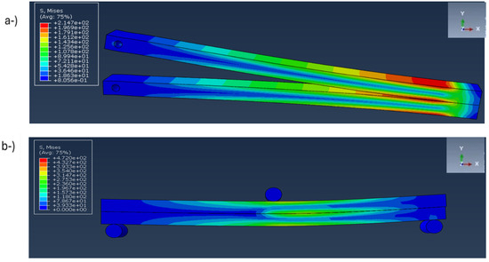 Example images of DCB test simulation (a) and ENF test simulation (b), FEA stress distribution result.