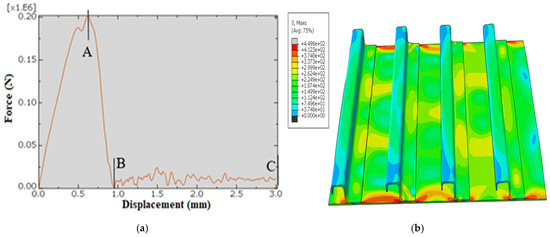 The force–displacement (F-D) curve for a skin–stringer model joined with adhesive and a reduced number of rivets typically shows the relationship between the applied force and the resulting displacement of the structure. This curve is crucial for understanding the mechanical behaviour of the assembly, including stiffness, strength, and failure modes. In such models, the adhesive helps distribute the load more evenly across the skin and stringer, potentially reducing stress concentrations around the rivets. This can lead to improved performance in terms of load-bearing capacity and fatigue resistance. The F-D curve can reveal key points such as the initial linear elastic region, the onset of plastic deformation, and the ultimate failure point. Studies have shown that using adhesives in combination with rivets can enhance the overall structural integrity and performance of skin–stringer assemblies. This hybrid approach can be particularly beneficial in aerospace applications where weight reduction and structural efficiency are critical. In this case, 3 × 4 = 12 rivets were used (around 16% of the 76-rivet model), and a 0.471 mm thick adhesive layer was added as shown in Figure 10a. The force–displacement graph for this model (Figure 10b) is very similar to the other model using adhesive and rivets, despite using significantly fewer rivets. The notable point in this graph is that once the rivets detach from the skin, the force closely matches the strength of the model that is solely adhesively bonded. After a 3 mm displacement, the stress distribution on the model is shown in Figure 10c.