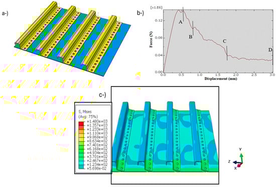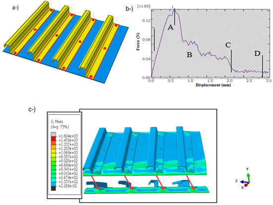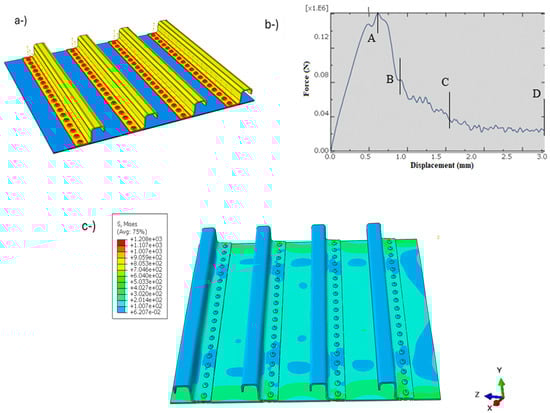 The rivets are modelled as 19 × 4 = 76 pieces, and the adhesives are modelled to contact the stringers throughout an applied adhesive 0.471 mm with rivets as shown in Figure 9a. The modelling concept remains the same as for the other types. In consequence of the analysis, the force–displacement graph is given in Figure 9b. As shown in the graph, when the skin–stringer model is subjected to loading, the maximum loading point matches that of the adhesively bonded concept. At the maximum loading condition (point A), the adhesive begins to fail. After the adhesive breaks, there is a sudden drop in the force graph until it reaches the point where the rivet starts to carry the load (point B). This same drop is observed in the skin–stringer model attached only with adhesive. Beyond this point, the behaviour resembles that of the rivet-only model, and the force–displacement graph follows a similar pattern. At the region marked by letter C, most of the first row of rivets separate from the skin. Due to the displacement loading until the end of the graph, roughly 3 mm, Figure 9c illustrates that the rivets in the first row have detached from the skin, and the adhesive has failed up to a certain distance.