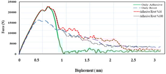 - The force–displacement curves for the four different models are shown in Figure 11. Comparing the models reveals that those with adhesive have higher strength, but the strength of the adhesive-only model drops sharply after reaching the maximum force. Adding rivets prevents this sudden drop, as the rivets carry the load at that point. It is observed that the number of rivets to be used with adhesive can be significantly reduced and their strength can be increased, as well as the weight caused by the rivets on the aircraft can be reduced. At the same time, the stress concentration around the holes drilled for the rivets will affect the system much less due to the small number of rivets in the hybrid connection and will contribute positively to the fatigue strength. Filling the skin and stringer with adhesive will also protect the materials from the risk of corrosion. In aircraft design, sealant is applied between materials to reduce the risk of corrosion in metal-to-metal contact. Since the adhesive itself performs this task, there will be no need to use sealant, and the weight effect of the sealant will be eliminated.