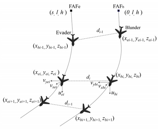 During parallel approaches, two aircraft on adjacent flight paths may conduct either independent or dependent parallel approaches. If one aircraft unintentionally deviates from its intended flight path due to factors such as human error or equipment malfunction—a phenomenon known as a blunder [18]—it forms a deviation angle relative to the nominal approach trajectory. In such cases, the ground-based air traffic controller responsible for the deviating aircraft detects the anomaly via radar monitoring and immediately issues an instruction for the aircraft to return to its planned flight path. Simultaneously, the other aircraft on the adjacent parallel approach path receives an avoidance instruction from the controller and executes an evasive maneuver.
